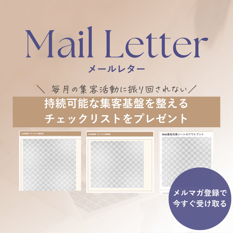 「毎月の集客活動に振り回されない。持続可能な集客基盤を整えるチェックリスト」をプレゼント中! 無料で受け取る
